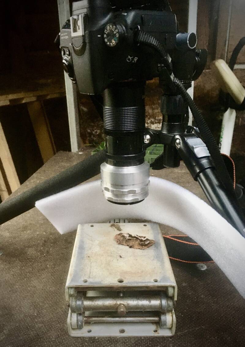 Dit was de opstelling voor de macrofoto, een lab Jack om de korrelwebzwam in focus te brengen wat verpakkingsmateriaal van Ikea en een bouwstellage als werktafel en de ex geitenstal als werkruimte.