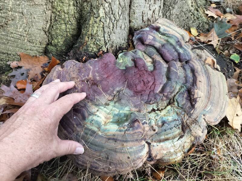 Dat de gevallen neerslag positief heeft gewerkt op de mycoflora bleek uit het feit dat op de terugweg nog druk werd genoteerd. De score liep op tot pakweg 150 soorten. Die terugweg verliep deels langs de dubbel beboomde berm van de Duerswâldmer Wei, de weg die Bakkeveen met Wijnjewoude verbindt. Dat ziet er daar beslist veelbelovend uit, maar dat hangt ook af van het maaibeleid. Een zeer opvallende soort op het eind van onze rondgang was een Harslakzwam (Ganoderma resinaceum). Eerst opgedroogd gefotografeerd en daarna opgefrist en wel, maar je ziet dat het een oudje is.