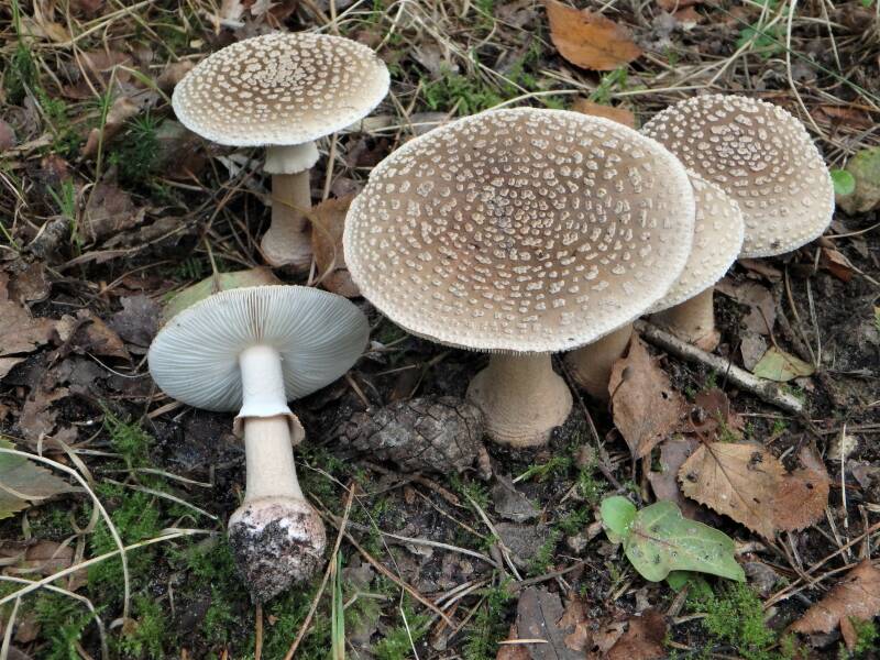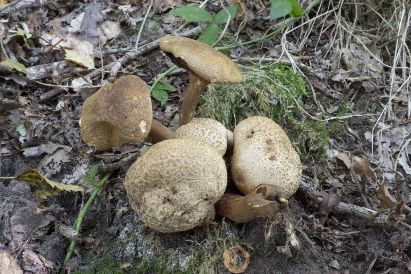 Eigenlijk viel de uiteindelijke oogst op deze dag gezien de warme, droge periode best mee met tegen de honderd soorten. Veelal waren het per soort maar enkele exemplaren, bijvoorbeeld van de Papilrussula (Russula caerulea) en soms was het zelfs maar één, zoals van de Duivelsbroodrussula (R. sardonia). Dat gold ook voor een klein plooirokje die we gelukkig niet over het hoofd zagen. Je hoopt dan op een minder algemeen voorkomend plooirokje, maar ook hier moest ik me helaas tevreden stellen met het Geelbruin plooirokje (Parasola leiocephalus). Boleten zagen we naast de al genoemde Kastanjeboleet vaker. Bij Grove den veel Koeienboleten (Suillus bovinus) en de Bruine ringboleet (S. luteus (GE), bij Lariks de Gele ringboleet (S. grevillei) en bij berken de Bruingrijze berkenboleet (Leccinum cyaneobasileucum) en de Gewone berkenboleet (L. scabrum). Op een heideterreintje diende zich een boleet aan waar ik geen raad mee wist en dus besloot ik er één mee naar huis te nemen. Pas daar kwam het besef wat ik voor me had, want de Melkboleet (Suillus granulatus (BE)) had ik twee jaar eerder tijdens de buitenlandse werkweek in Zweden enkele keren gezien. Ik dacht wel: ”Het wordt hard minder dat je het beeld ervan alweer kwijt was”. In Nederland had ik hem nog niet eerder gezien, hoewel hij wordt omschreven als een vrij algemene soort.