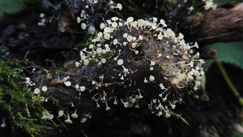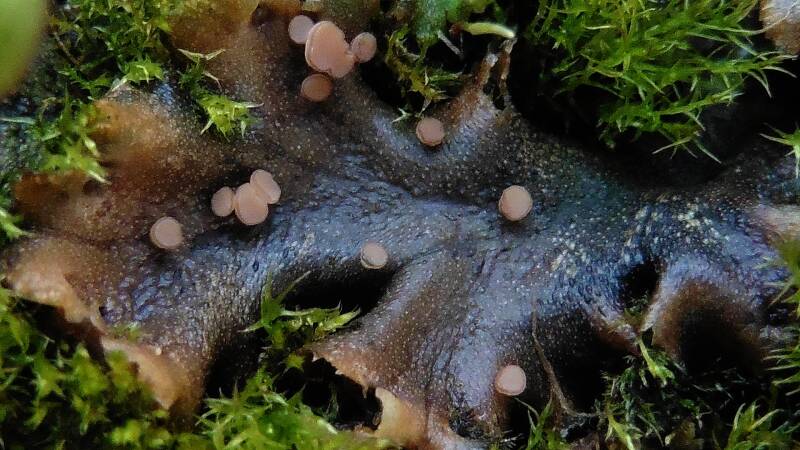 Henk heeft in de loop der jaren inmiddels een imposante lijst met namen van waarnemingen van paddenstoelen in eigen tuin opgebouwd, waaronder het nodige 'Klein Spul'. Dit kommetje (Bryoscyphus atromarginatus) is er één van en die leidt mogelijk (vrijwel zeker) een zwak parasitische leefwijze, hier op een levermos. Voor 1990 stond dit ascootje nog niet vermeld op de Verspreidingsatlas, maar inmiddels staat hij in 25 hokken genoteerd, waarvan 7 zich in de provincie Groningen bevinden en geen in Drenthe en Friesland. Dat noemen we dus een waar-nemerseffect.