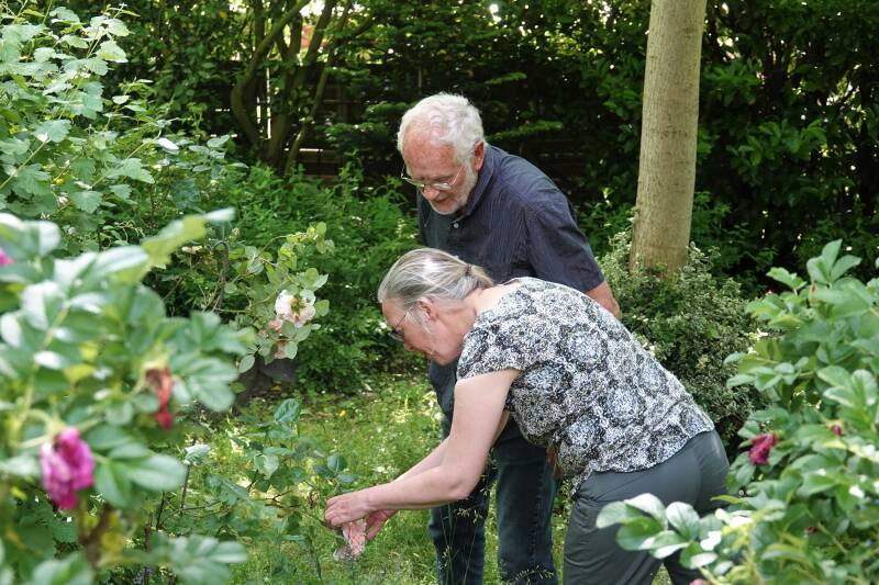 Ook bij de andere Inge (en Willem (r.b.)) is het lekker rustig, hoewel het op hun vorige plekje in Glimmen ook vrij stil was. Weliswaar hoorde je daar regelmatig de trein langskomen, maar dat was in een oogwenk voorbij. Op een gegeven moment hoor je dat niet meer. Zij wonen er in een mooie rietgedekte, degelijke woning iets boven het dorp Sellingen. Wat bij hen achter hun huis wel opvalt zijn de hoge windmolens in Duitsland, maar, zeggen ze, daar hebben ze helemaal geen last van. Bovendien kun er er buiten zitten zonder uitzicht erop. We hadden wat planten meegenomen wat in dank werd aanvaard. De tuin is iets waar nog wel iets aan kan veranderen, maar voor de rest kwamen ze in een tamelijk gespreid bedje terecht. We zijn uiteraard benieuwd hoe vaak we beide dames straks nog op de excursies mogen begroeten, want het is dan van daaruit wel een eindje rijden.