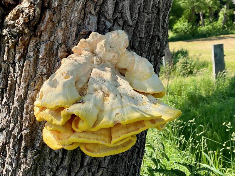 Ook voor paddenstoelen heeft Arjan steeds meer oog en hij was ronduit enthousiast over deze Laetiporus sulphureus. Dat temperde ik wel een beetje en verwees hem daarbij naar pagina 365 van de Veldgids Paddenstoelen in Noordenveld waar de Zwavelzwam er een stuk gekleurder op staat. En vaak zijn ze nog mooier! Mijn eerste ervaring met deze (soms) fraaie zwam dateert van twintig jaar geleden toen wij i.h.k.v. het Paddenstoelenmeetnet door Mirjam Veerkamp een ons toegewezen plot in het Norgerholt verkenden. Direct bij de ingang van het bos stond deze zwam te pronken en Mirjam vroeg ons of we deze zwam wel kenden. We moesten het antwoord schuldig blijven, want alles was nieuw voor ons, maar die 'rode met witte stippen' kenden we wel. Gelukkig hebben we sindsdien er wel het e.e.a. bijgeleerd...