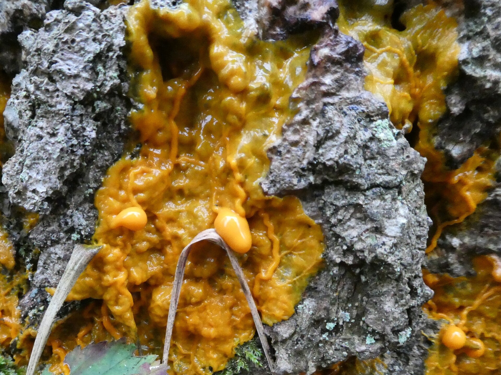Het zou overigens best om het Troskalknetje, Badhamia utricularis kunnen gaan, een algemeen voorkomende soort op boomstammen. Dan zou hij vruchtlichamen hangend aan gele draadjes moeten ontdekken zoals te zien ophttps://www.verspreidingsatlas.nl/0903120. Maar nogmaals die conclusie valt niet te trekken uit de bijgaande foto's.