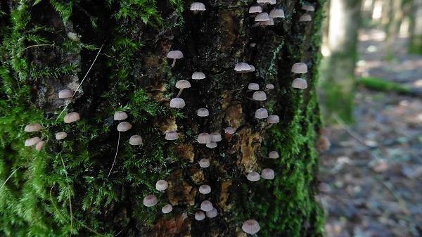 Parasolletjes en aanverwante artikelen zien we er ook altijd en daar was zelfs een nieuwkomer bij, namelijk de Zijdechampignonparasol (Leucoagaricus sericifer), een waarneming die later ook nog door Kor werd gecontroleerd en bevestigd. Bij een zwarte kledder trilzwam werd gedacht aan de Teervlekkentrilzwam (Exidia pithya), maar die wacht nog op bevestiging door Roeland Enzlin. In het loofbosje naast de sparrenplantage troffen we op de stammen van de Zomereik talloze schorsmycena’s, waaronder de Lilabruine schorsmycena (Mycena meliigena (BE)). Vermoedelijk komt deze soort veel meer voor en zal t.z.t. de status BE worden bijgesteld. Een blik op de Verspreidingsatlas bevestigt deze verwachting, want kwam de soort voor 1990 in 8 uurhokken voor, nu is hij al in meer dan 80 uurhokken gesignaleerd. Ook heel aardig om weer te zien was de Stinkende roodsnedemycena, die Henk en ik eerder vonden in het nabij gelegen Stormbos. Dat ’Stormbos’ is geen officiële naam, maar wordt zo genoemd omdat in 1972 een hevige storm een ravage aanrichtte. De schade werd hersteld, maar in bosvak 165 bleven tientallen omver gewaaide bomen liggen en mocht de natuur haar gang gaan. Dat leverde daar een ’mooi stukje’ natuur op waar in de vele opeenvolgende jaren successievelijk vele soorten waren te bewonderen. Dat proces is nog steeds gaande, hoewel het aantal verrassende soorten wel afneemt.