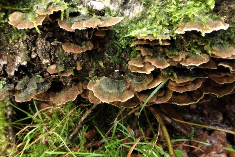 Via een pad dat het sparrenbosje scheidt van een strook met loofbomen werd de terugweg aanvaard. Meestal volgen we het schelpenpad langs de heide, omdat we dan eerder terug zijn. Nu konden we het aantal soorten nog behoorlijk opkrikken, want in tegenstelling tot de vorige inventarisatie viel er best veel te beleven. Er stonden op meerdere plekken opvallend veel plukjes Gewoon varkensoor (Otidea onotica (KW)). Wat vooral de aandacht trok was een polypoor die groeide in een strook van een meter op een liggende, dode eikenstam waarbij we niet direct een naam paraat hadden. Er werd getwijfeld, maar uiteindelijk kwamen we tot de conclusie dat het een Doolhofelfenbankje (Cerrena unicolor (BE)) was, een soort die bij eerdere gelegenheden vlotter werd benoemd.