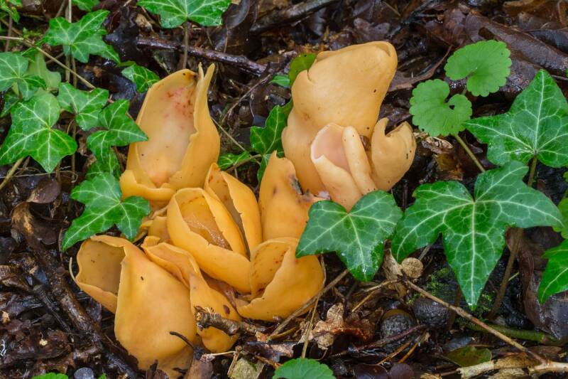 Deze waarneming, buiten het meetpunt, maar wel in hetzelfde bosje, werd voorafgegaan door enkele andere mooie vondsten. Daarbij was het Echt hazenoor (Otidea leporina (BE)) dat tegenwoordig als een vrij algemene soort mag worden beschouwd. En dus is dat ’BE’ niet geheel op zijn plaats, want was hij voor 1990 in 20 atlasblokken aanwezig, nu is dat aantal verdriedubbeld en komt hij, op één na, in alle provincies voor. Zeeland en Zuid-Limburg zijn nog witte vlekken op de kaart. Ook vrij algemeen is de Purperknolcollybia (Collybia tuberosa (KW)) die we vrijwel gelijktijdig met zijn verwant de Okerknolcollybia (C. cookei) vonden.