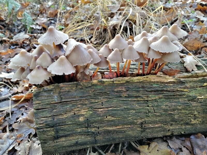 Direct vanaf de parkeerplaats konden we volop aan de bak. Veel mycena’s, vooral kleintjes, iets dat je in deze tijd van het jaar kunt en mag verwachten. Eigenlijk kwamen er voornamelijk ’gewone’ vrij gemakkelijk te benoemen soorten op de lijst te staan en opvallend genoeg was daar geen enkele soort van de Rode Lijst bij. Maar ja, uiteindelijk strooide Inge roet in het eten door later met de Roze peutermycena (Mycena smithiana (KW)) op de proppen te komen, waardoor het net geen unieke lijst werd. Overigens is deze peuter ongetwijfeld veel meer te vinden als er gericht naar wordt gezocht, maar ja, dan moet er gegraaid worden in het opgehoopte bladafval en daar krijg je vieze, koude vingertjes van. Als dat wel zou gebeuren zou de status van vrij algemeen veranderen in algemeen en misschien wel in zeer algemeen. Volgens de Verspreidingsatlas staat de teller nu nog op 111 uurhokken.