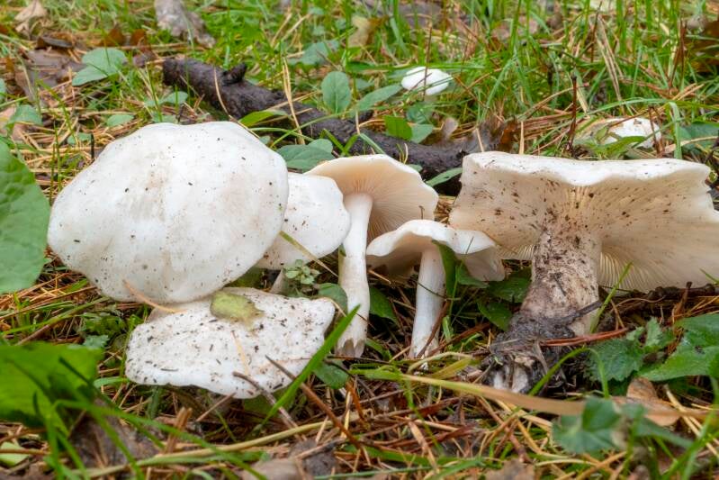 Verwarring kan ook ontstaan bij witte ridderzwammen. We zagen een mooie groep staan zo tegen het eind van de excursie waarbij de vraag zich opdrong met welke soort we hier te maken hadden. De Witte duifridderzwam (Tricholoma columbetta (BE)) viel af, want die heeft een zwakke meelgeur. Deze echter hadden een kenmerkende geur, maar over hoe die moet worden omschreven wordt verschillend gedacht. Je zou dat gemakkelijk als onaangenaam kunnen duiden, maar ikzelf vind het geen onaangename geur. Maar hoe dan wel? Feit is dat er twee kandidaten overblijven en wel de Okerwitte ridderzwam (T. stiparophyllum (KW)) en de Witte ridderzwam (T. album (KW)). Die eerste heb ik samen met Henk Pras voor het eerst in Drenthe bij Peest ontdekt en later kwamen we hem met de werkgroep nog een keer in het Natuurschoonbos tegen. Maar die wordt niet voor niets okerwit genoemd vanwege de hoedkleur en dat ontbrak eraan en dus kwamen we uit op de Witte ridderzwam. Microscopisch zijn ze nauwelijks van elkaar te onderscheiden.