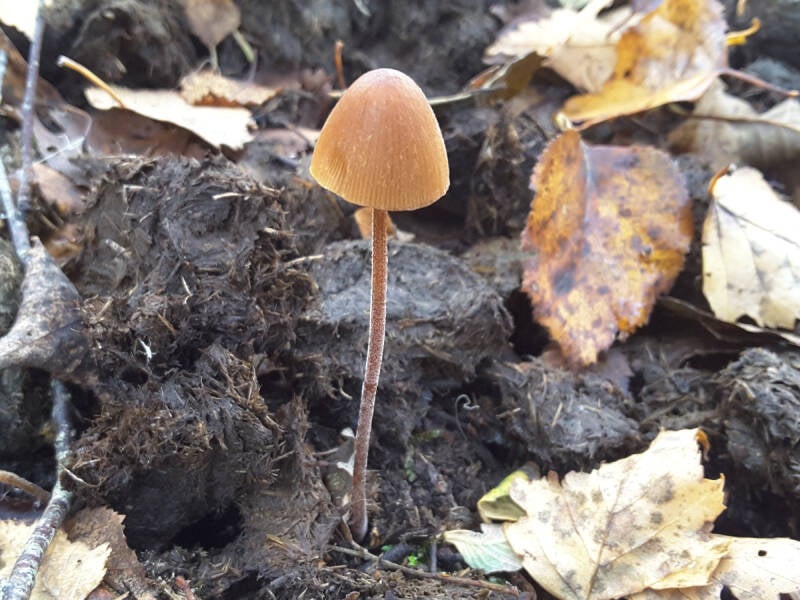 Met nog iets meer spoed werd op weg naar ’zuidoost’ de volgende hindernis genomen om na zo’n 500 meter eindelijk een veelbelovend kleddernat wilgen/berkenstruweel in te duiken. Het miegelde daar inderdaad van de paddenstoelen. Iemand in het gezelschap verzuchtte dat hij nog nooit zoveel Roodgrijze melkzwammen (Lactarius vietus (KW)) had gezien. Vele honderden waren het Er stond veel meer, zoals mooi gekleurde gordijnzwammen, maar voor een deel kon daar nog geen naam aan worden gegeven. Wel natuurlijk aan de Koperrode gordijnzwam (Cortinarius uliginosus) die je een typische vertegenwoordiger voor zo’n milieu kunt noemen. Verder vielen de vele, soms fors uit de kluiten gewassen Donzige melkzwammen (Lactarius pubescens) op en zijn familielid de Baardige melkzwam (L. torminosus) stond er ook. Een stuk kleiner was de Dwergvaalhoed (Hebeloma birrus (BE)) die we trouwens ook al in de eerste laan vonden. Dat BE moet je maar met een korreltje zout nemen, want zo zeldzaam is hij niet (meer). En wat betreft zijn formaat zou de Nederlandse naam beter passen bij de Wilgenvaalhoed,(Hebeloma pusillum) want die is gemiddeld meer dan de helft kleiner. De 2e Latijnse naam is hier helemaal correct, want dat betekent ’zeer klein’. Een vrij schraal grazig stukje leverde weinig op, maar in de rietzone ernaast werd nog wel een bijzonderheidje gevonden: de Rietmycena (Mycena belliae (BE)).