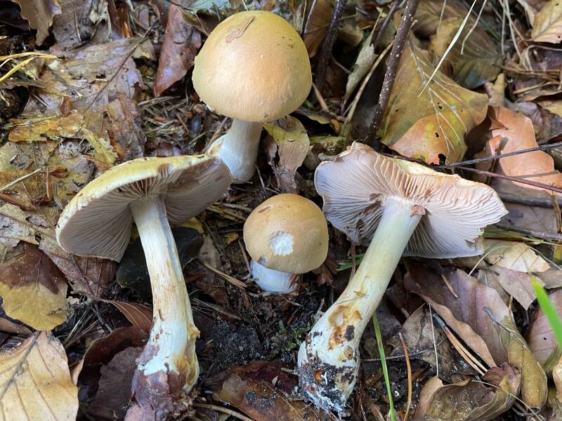 Jacob moest iets eerder afscheid van ons nemen en we waarschuwden hem al dat hij waarschijnlijk tal van bijzondere soorten zou gaan missen. Dat bleek vooral bij het keerpunt op de route, wat als meetpunt De Overgang werd genoemd (het doorbreekt daar de Oude Vaart) en valt op door de dicht op elkaar geplante beuken aan weerszijden. Toendertijd was het geselecteerd vanwege de aanwezigheid van de Kleverige knolamaniet (Amanita virosa (BE)) die we voorwaar in de buurt meenden te zien. Het bleek echter de witte varieteit van de Gele knolamaniet te zijn (Amanita citrina var. alba). Bij mij staat deze overgang vooral bekend dankzij de aanwezigheid (slechts twee keer) van de Slijmerige blekerik (Pholiota lenta (GE)), die ik sowieso maar weinig zie. Vaker is daar de Rimpelige gordijnzwam (Cortinarius lividoochraceus (BE)) aanwezig. Deze kregen we nu, zij het op een andere (vaste) plek wél in de smiezen. Het is een opvallende verschijning met zijn fraaie lichtviolet gekleurde steel.