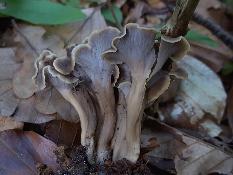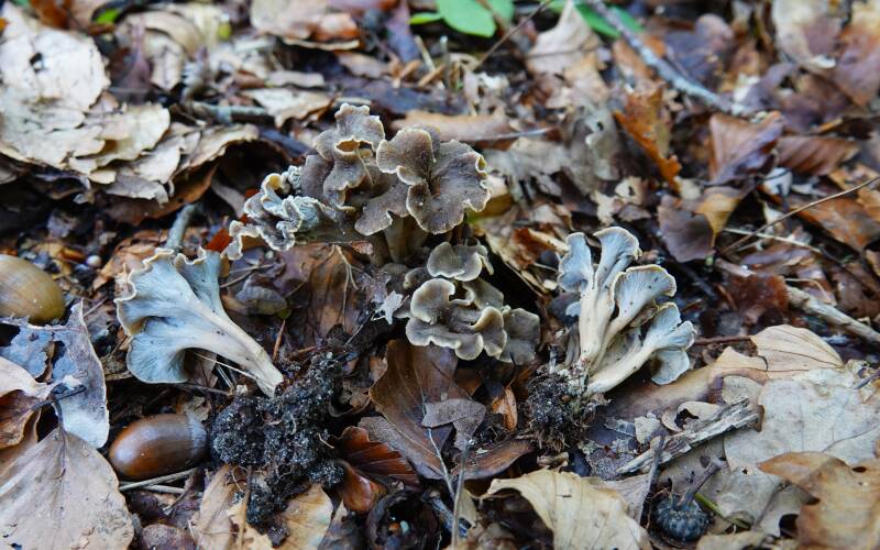 Voor deze ontdekking viel een grote groep zwammetjes minder op in de herfstige bosbodem, want er werd pardoes op gestaan. Het ging dan ook om de Kleine trompetzwam (Pseudocraterellus undulatus (KW)) en die valt niet echt op. Er stonden er gelukkig heel wat en de schade was gering. Het was daar sowieso een goede plek voor allerlei paddenstoelen: Zeemkleurig hazenoor (Otidea alutacea), Donker hazenoor (O. bufonia), Witte- en Zwarte kluifzwam (Helvella crispa en H. lacunosa), Kleine bruine bekerzwam (Humaria hemisphaerica), als buitenbeentje de Spoelsporige vaalhoed (Hebeloma fusisporum (Mic. GV) en uiteraard ontbrak de hier talrijk aanwezige, vies chemisch geurende (naar koolteer/carbid/stadsgas) Narcisridderzwam (Tricholoma sulphureum) niet. Deze manifesteert zich hier (en elders) vooral dankzij het schelpenpad dat het bos doorsnijdt. Naast de bekende gele vorm vond we hier ook de bruine vorm ervan.