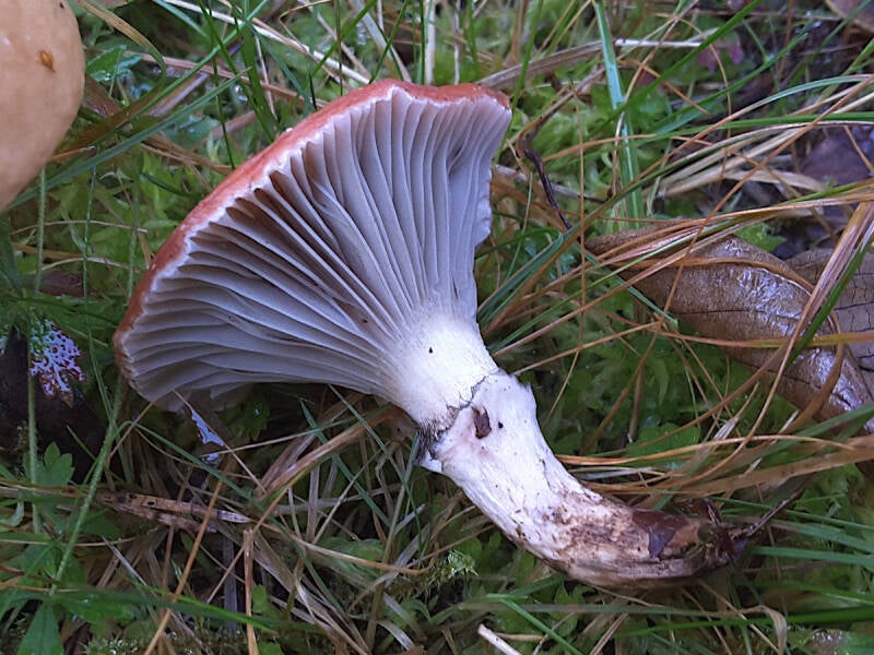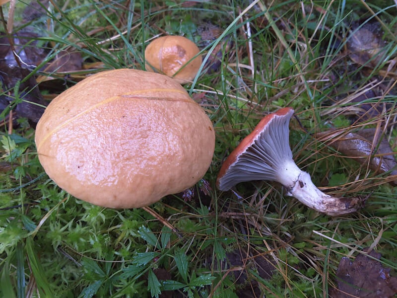 Een in het veld goed herkenbare gordijnzwam is de Roodschubbige- (Cortinarius bolaris (KW)). Daarover kon nog worden verteld dat hij voor 2000 uitgestorven leek, maar sindsdien een opmerkelijke revival kende. Ook de Fraaie gifgordijnzwam (C. rubellus) zie je steeds meer. Naast de nodige melkzwammen waren er diverse russula's, waarbij een grote groep van de Fijnplaatrussula (Russula densifolia) eruit sprong. Ik telde pakweg 125 exemplaren. Een andere 'rus' was de Duivelsbroodrussula (R. sardonia), niemand wilde even proeven, die bij naaldbomen groeit. Dat geldt tevens voor de Papilrussula (R. caerulea). Ook tal van boleten zijn begeleiders van naaldbomen, zoals de Gele ringboleet (Suillus grevillei) bij Lariks en de Bruine ringboleet (S. luteus (GE)) bij den. Bij een groepje dennen werd vergeefs uitgekeken naar de Fijnschubbige boleet (S. variegatus (BE)), maar die zien we nog maar zelden. Voor de Koeienboleet (S. bovinus) geldt dat je die werkelijk overal in het bos tegenkomt waar dennen staan. Goede kans dat je dan ook de Roze spijkerzwam (Gomphidius roseus) daarbij ziet, omdat deze het mycelium van die boleten parasiteert. We zagen hem inderdaad, iets nadat Jacob Poortstra ons gezelschap had verlaten