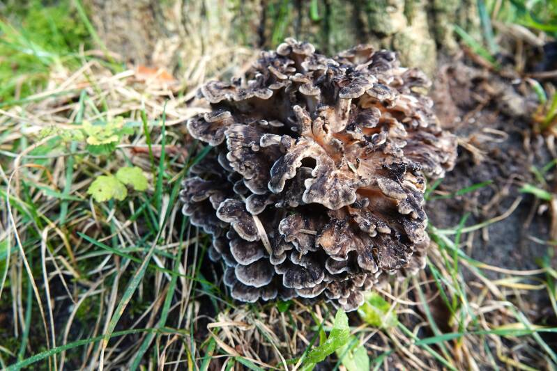 Langs dat schelpenpad konden we nog een trits aan soorten noteren. De Gele stekelzwam (Hydnum repandum (KW)) is hier een bekende verschijning, maar ook zijn familielid de Rossige stekelzwam (H. rufescens (KW) vonden we er. En naast de eerder genoemde Rimpelige gordijnzwam was de Paarse galgordijnzwam (Cortinarius croceocaeruleus) een soort waar uitgebreid aandacht voor was. Dankzij de kalkrijke omgeving staan er vanouds veel soorten vezelkoppen waarvan je de Gewone viltkop (Inocybe dulcamara) en de Lilagrijze vezelkop (I. lilacina) in het veld kunt benoemen, maar andere microscopisch moeten worden beoordeeld. De totaalscore kwam uit op ruim 130 soorten en zoals eerder werd opgemerkt was dit een onverwacht hoog aantal.