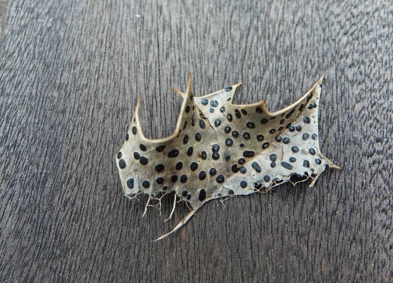 Eén van de mooiere soorten die we tegenkwamen was zonder meer de Goudvinkzwam (Pholiota astragalina (KW)). Ria herinnerde hem van het vorige seizoen toen hij op dezelfde plek stond te pronken. Wellicht bevat het substraat nog voldoende voedsel en vertoont hij ’zijn kunstje’ hier nóg enkele jaren. Bij een Kleine bloedsteelmycena (Mycena sanguinolenta (GE)) werd voorwaar even gedacht dat het de Stinkende roodsnedemycena (M. capillaripes) was, maar die heeft geen bloedende steel. Enige verwarring was er ook toen afgevallen hulstbladeren werden geïnspecteerd en we meenden het Hulstbladstipje (Guignardia philoprina) te ontwaren. Dat moest later worden herroepen, want nadere controle wees uit dat het een Hulstschoteltje (Phacidium multivalve) betrof. Die is wat groter (pakweg 2 om 1 mm) dan het Hulstdekselbekertje (Trochila ilicina), die dan wel weer bredere sporen heeft.