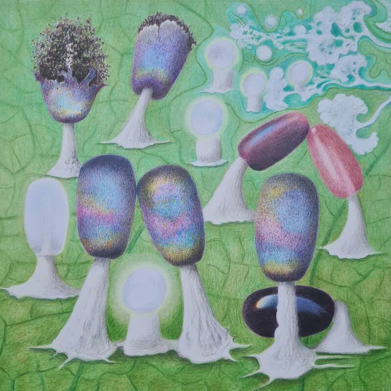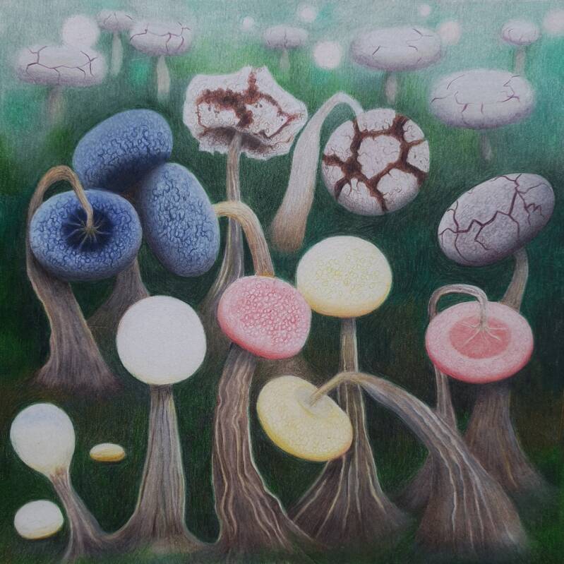 Geertje Geertsma laat zich graag door de paddenstoelen in het veld inspireren en hierboven zie je waartoe dit kan leiden. Het zijn tekeningen, gemaakt met kleurpotloden. Gezien de fraaie uitvoering is dat niet direct de techniek waar je dan aan denkt. De bovenste twee zijn (fantasie)myxomyceten, maar daaronder zie je herkenbare soorten. Geertje timmert overigens (semi)professioneel aan de weg en is van veel en veel meer markten thuis. Eén en ander is te zien op haar website: www.geertjegeertsma.com