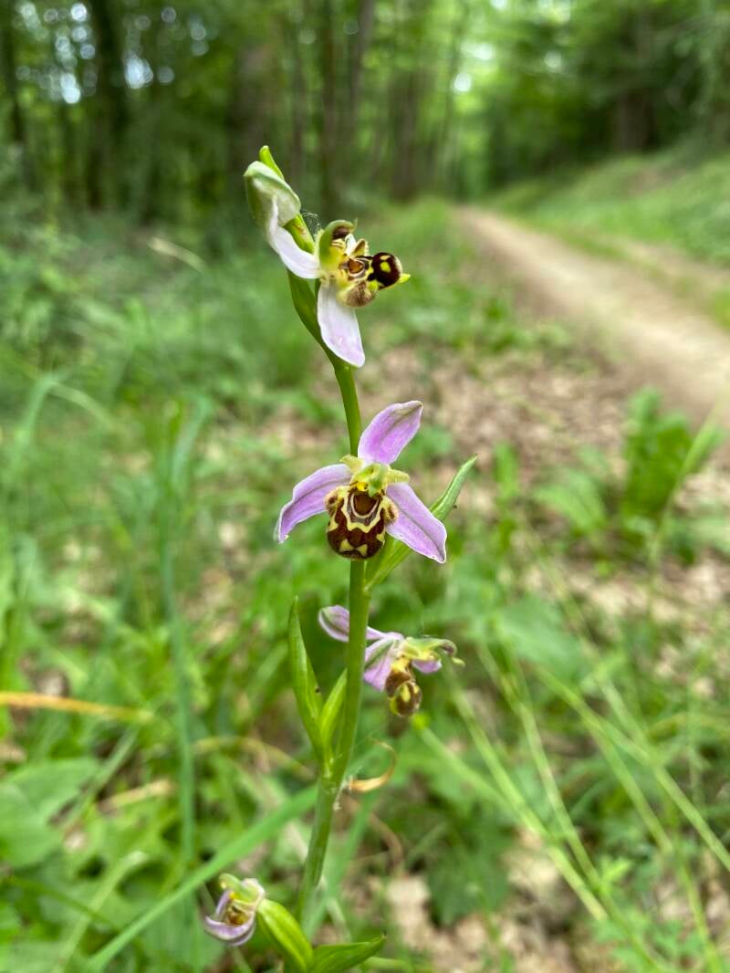 Veruit de algemeenste orchidee was Hondskruid. Die zagen we werkelijk overal: hooi- en weilanden, bermen, randen van bospaden en gazons stonden er vol mee. We zagen particuliere gazons waar netjes om de hondskruidplanten heen was gemaaid. Bij elkaar moeten we honderdduizenden exemplaren van deze soort gezien hebben. Op ruime afstand – maar nog altijd behoorlijk algemeen – volgde als tweede de Bokkenorchis. Een forse plant, die er van een afstandje weinig kleurrijk uitziet, en bovendien nogal slordig, met die rare gedraaide bloemuitsteeksels. Maar wat zijn die verlengde bloemlippen bijzonder als je ze van dichtbij bekijkt!