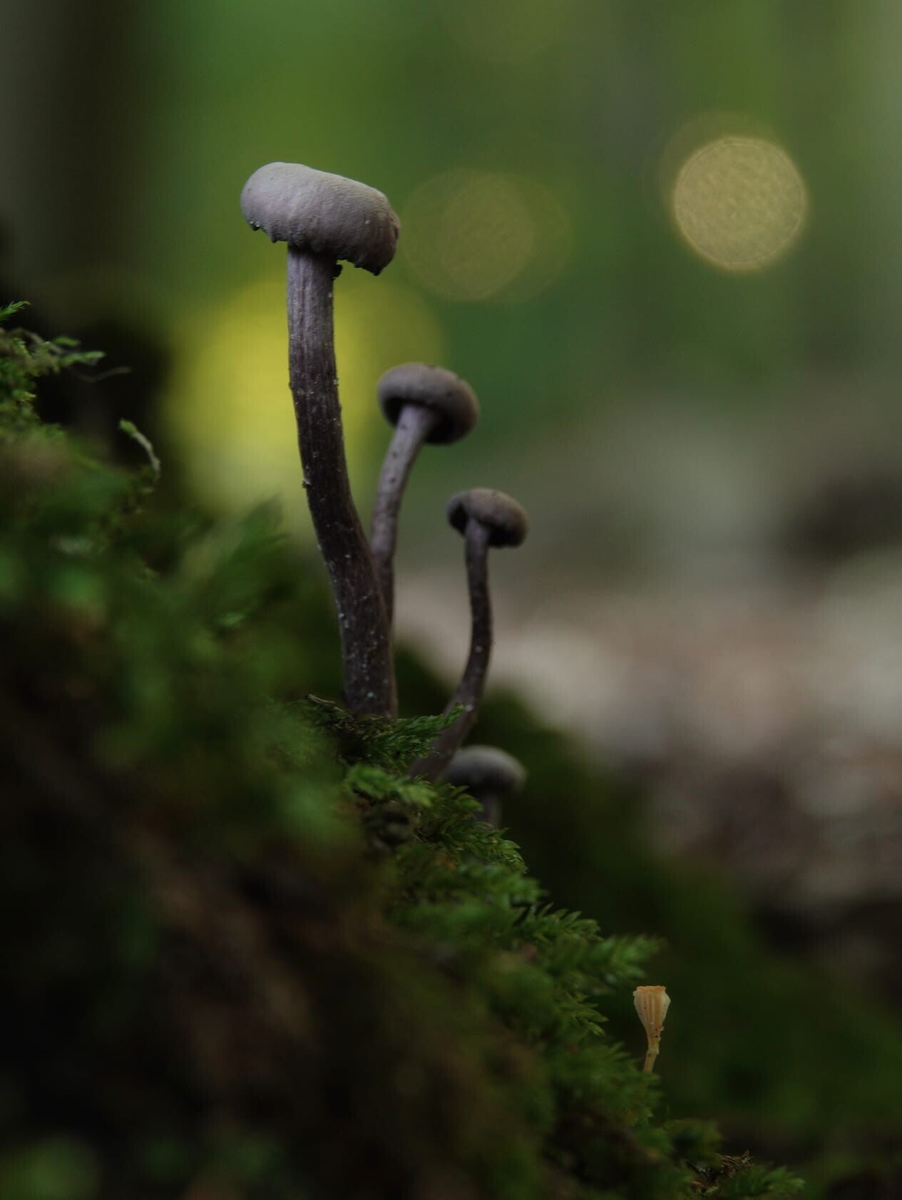 Satijnzwammen (Entolomataceae), hierboven afgebeeld, zijn er in vele soorten en maten, maar in de regel zijn de meeste vrij klein en om ze onbeschadigd te fotograferen moet er met tact worden gehandeld. Het mooiste is dat je ze op de groeiplek kunt laten staan zoals hier links en rechts is gebeurd. De foto's zijn gemaakt door Bart Pijper uit Stuifzand die hier met partner Nina enkele weken in Roden verbleef en zijn gemaakt op het Moltmakersstuk, het heidegebiedje in het Mensingebos. Links zien we de Bruine zwartsneesatijnzwam (Entoloma caesiocinctum (KW)) en in het midden de Zwartsneesatijnzwam (E. serrulatum (KW). Nieuw voor het gebied is de Tepelsatijnzwam (E. papillatum (KW)) die hier mooi in een plukje bijeen staan. Ze groeiden daar begin augustus naast het schelpenpad toen we dankzij de gunstige weersomstandigheden een paar weken konden genieten van een overvloed aan paddenstoelen.